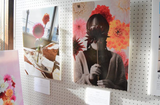 塙町から頂いたのダリアの生花を実際に観察して、イラスト制作を行う学生、写真撮影を行う学生と、それぞれの手法で表現しています。