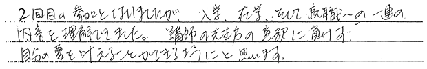 「環境・施設が整っていて、先生方、講師の先生も優秀な方々と聞いて安心できました。地元を大切にという思いにも同感できますし、何より就職実績、資格取得実績の高いことが良かったです。説明会がとても有意義でした。ありがとうございました。」