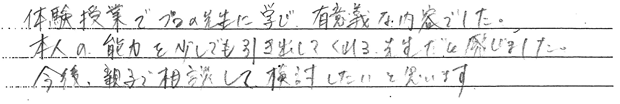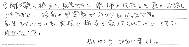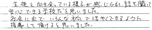 「本日は先生はじめ在校生のみなさんが丁寧な説明でとてもわかりやすかったです。ありがとうございました。本人も実際学校に来てみて実感できたことはたくさんあったと思います。」