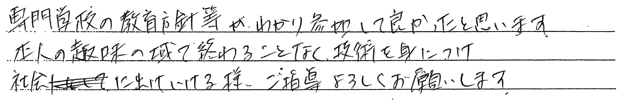 「卒業後のフォローも心配しておりましたが、話しを聞いて安心しました。今日の説明だけではわからない所が出てくると思いますが、その都度お聞きしたいと思います」
