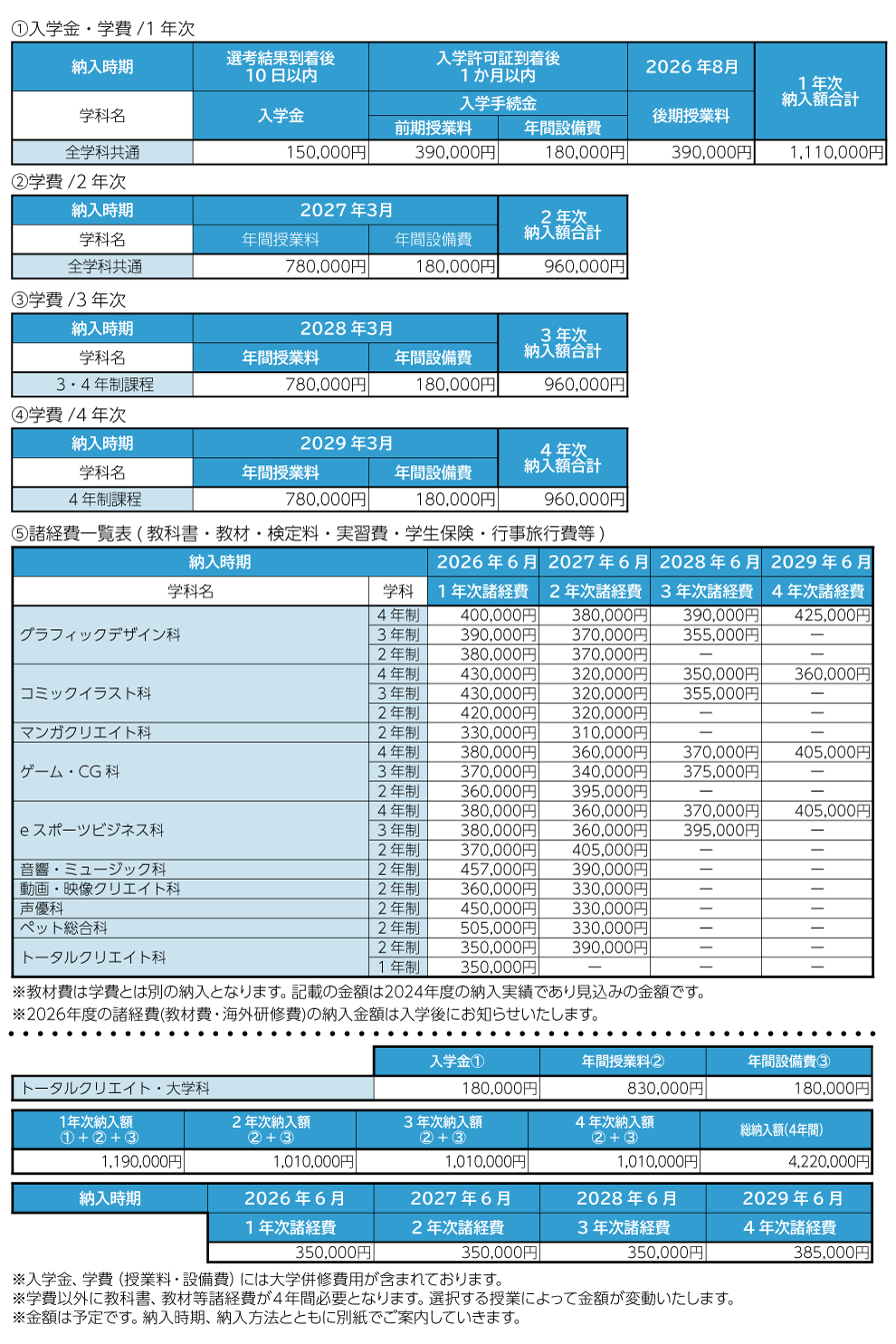 ⑥ 教材・実習費とは教科書・教材・実習消耗品・学生総合保障・国内研修・実習着・試験関連・ICTプラットフォーム利用料、イベント行事等の費用をいいます。