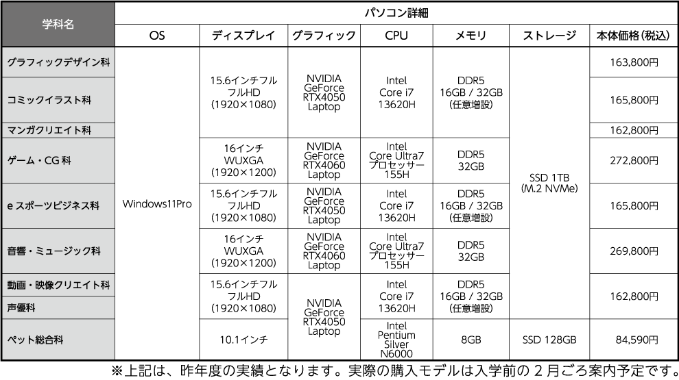 入学学科によって必要な機種やスペックが異なるため、入学前の2月下旬頃に文書にて購入モデルおよび金額等をお知らせいたします。なお、オンライン授業を実施する機会が多くなってきております。ご家庭におかれましてもインターネット環境の整備をお願いいたします。その他、ご不明な点は本校へでお問い合わせください。