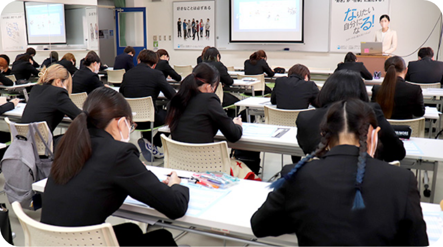 自己分析・就職先の研究・面接対策・履歴書の添削など、 就職活動全般にわたり学生一人ひとりへの指導を行い、 教職員全員で希望就職をサポートします。