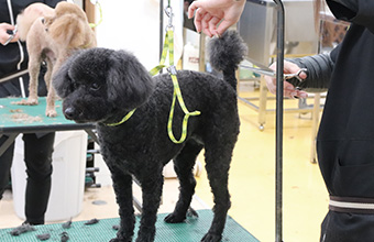 「お客様からわんちゃんをお預かり→オーダーに合わせたトリミング→お引渡し」まで実際のサロン同様の流れで行います。トリミング技術だけでなく接客スキルも身に付きます。